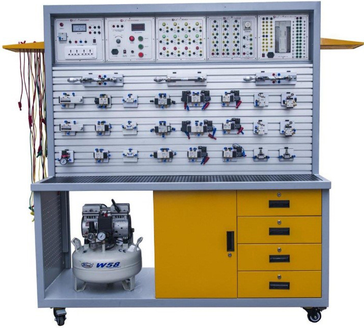 PLC控制氣動(dòng)實(shí)訓實(shí)訓裝備,由氣動(dòng)元件部分、電氣控制部分及實(shí)訓臺架等組成,電氣部分主要由PLC模塊、繼電器模塊、電源模塊、按鈕模塊等部分組成。實(shí)訓臺主體框架采用鋁木結構組裝完成,臺架重量較輕且安裝了萬(wàn)向輪,可方便實(shí)訓臺的移動(dòng)。臺架分上下兩層結構,上面可放置電氣模塊,下面是實(shí)訓屏,實(shí)訓屏采用帶槽鋁合金結構,方便各氣動(dòng)元件的安裝和拆卸,學(xué)生可以根據實(shí)驗需要在實(shí)訓屏上任意搭建氣動(dòng)回路,組成具有一定功能的氣動(dòng)系統。實(shí)訓臺采用模塊式結構,便于組合與擴展,提高了設備空間的利用率。
