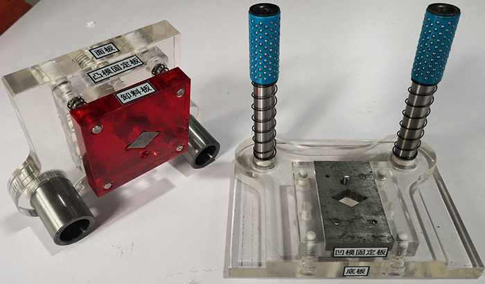 把板材料沿直線(xiàn)彎成各種形狀,可以加工形狀較復雜的零件。 以菱形工件作為導料,彎曲高度不小于10 mm,產(chǎn)品自動(dòng)從凸模脫落。 |