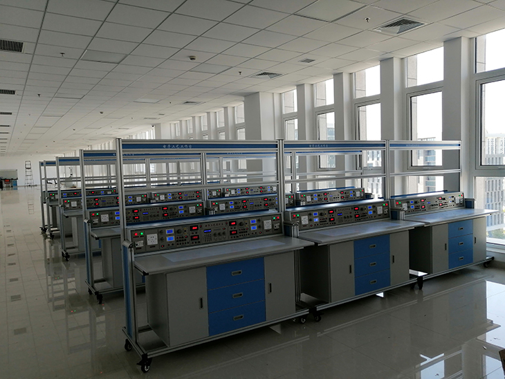 采用工業(yè)鋁合金型材框架,在電源控制屏上方為兩層結構。其中第一層既可放置外配儀器儀表,也可掛放其它通用電工電子實(shí)訓掛箱,擴展完成多門(mén)課程實(shí)訓;第二層可放置PVC夾板,用來(lái)夾放實(shí)訓圖紙。實(shí)訓臺下方還設有四個(gè)帶剎車(chē)的萬(wàn)向輪,便于移動(dòng)和固定。