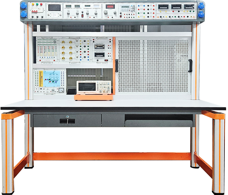 實(shí)驗桌后面二支桌腳向上延伸,配上特制拉模成型的帶滑槽橫梁鋁型材組成實(shí)訓屏,實(shí)訓時(shí)左邊放置電氣實(shí)訓掛箱(2層)及示波器支架,右邊裝置網(wǎng)孔板等,實(shí)訓掛箱、網(wǎng)孔板在實(shí)訓屏上實(shí)訓時(shí)上下方便,左右移位自如。實(shí)訓屏頂部安裝主機箱,實(shí)訓屏底部安裝實(shí)驗儀器工作電源箱。