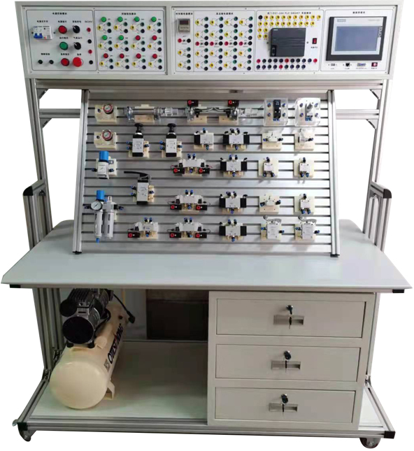 系統采用電、氣一體化結構,上半部分為自動(dòng)化控制箱,用以完成PLC、低壓電器等的安裝和接線(xiàn)。下半部分為標準化氣動(dòng)實(shí)訓板,用以完成氣動(dòng)元件的安裝固定、氣路及電路的連接。