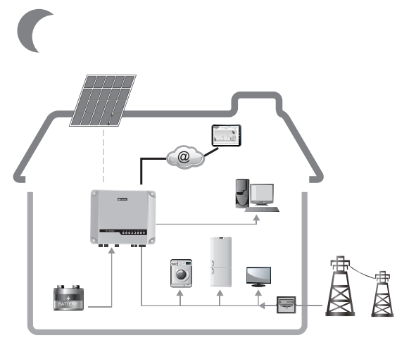 Ø 夜晚,光伏側直流停機,由儲能電池通過(guò)儲能逆變器單獨給負載供電,當電池剩余容量(SOC)放到設定值,系統自動(dòng)切入電網(wǎng),由電網(wǎng)給負載供電,根據需求,電網(wǎng)可以通過(guò)儲能逆變器給電池充電,也可以不充電;