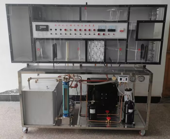 空氣熱濕處理實(shí)驗裝置為《空氣調節》課程實(shí)驗教學(xué)設備,用它可以模擬不同季節室內和室外的環(huán)境和空氣處理調節的方法,進(jìn) 行集中式空調系統不同循環(huán)形式的空氣調節實(shí)驗。還可以 做變風(fēng)量運行調節實(shí)驗和制冷系統的參數測定及其調節實(shí)驗。裝置具有透明風(fēng)管,可直觀(guān)地觀(guān)察和測試。實(shí)驗裝置的 結構由空氣循環(huán)系統、加濕器、加熱器、冷卻器及其冷水 機組和相應的測試儀表等組成?梢詫(shí)現對空氣的加熱、冷卻、加濕和除濕(表冷式和淋水式可互換使用)等處理。 在實(shí)驗中,還可以對空氣的溫度、濕度、流量進(jìn)行測量,并 能對加溫器、加熱器的輸入電功率進(jìn)行測定,從而可以計算各空氣處理過(guò)程中的熱量和濕量得失,以及進(jìn)行熱、濕平衡 的分析。