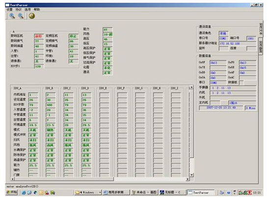 中央空調機由于工程復雜,設備分散,有的已經(jīng)裝修在開(kāi)花板上測試程序,一但出現了故障,工程量相當大,為了能夠快速準確地測出故障是由主機機組還是室內機的故障的,每個(gè)生產(chǎn)廠(chǎng)家根據生產(chǎn)的和維修的需要而開(kāi)發(fā)了中央空調測試程序?蓽y試壓縮機的運轉頻率,傳感器的各種數據,電子膨脹閥的工作步數等幾十種中央空調的工作數據和狀態(tài),軟件可實(shí)現對內機的控制,,可以對1-64臺內機的狀態(tài)進(jìn)行設定。是高校提供了好的研究的學(xué)習設備。