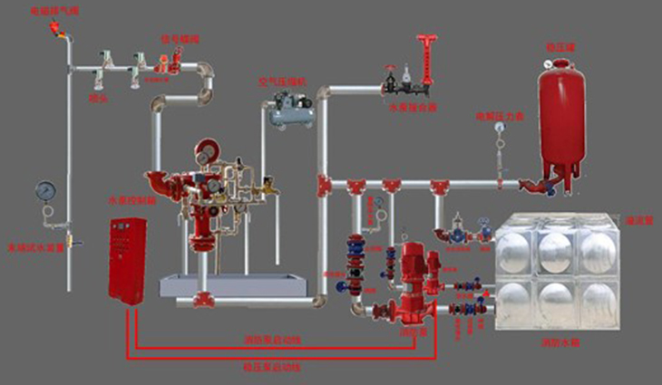 由閉式灑水噴頭、水流指示器、預作用報警閥組以及管道和供水設施等組成,準工作狀態(tài)時(shí)配水管道內不充水,由火災自動(dòng)報警系統自動(dòng)開(kāi)啟雨淋報警閥后,轉換成為濕式系統的閉式系統。