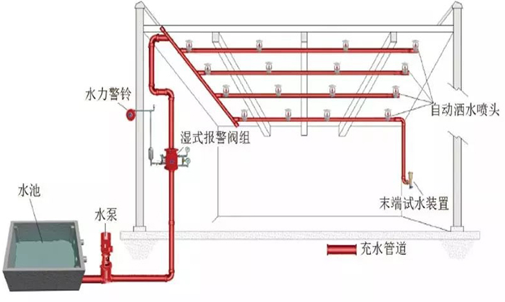 由噴頭、管道系統、濕式報警閥、報警裝置和供水設施等組成。由于該系統在報警閥的前后管道內始終充滿(mǎn)著(zhù)壓力水,故稱(chēng)濕式噴水滅火系統或濕管系統。