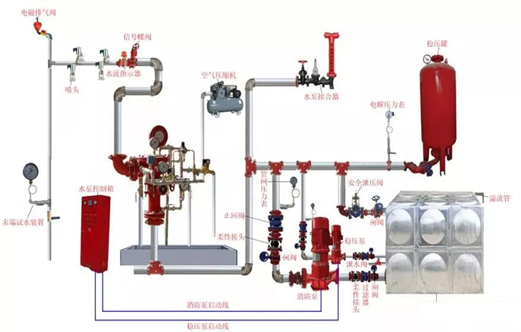 干式系統的基本構成條件包括水源、加壓與穩壓設施、壓力氣源、報警裝置、管網(wǎng)及閉式噴頭等部分。