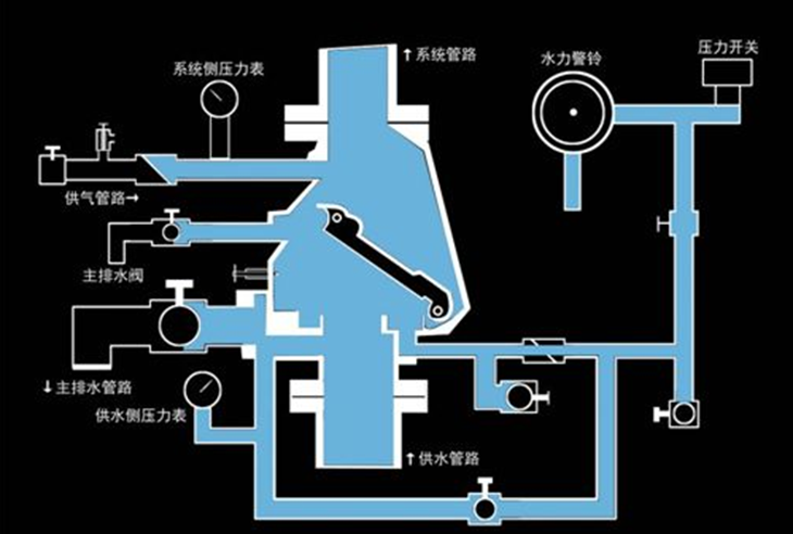 當系統處于伺應狀態(tài)時(shí),座圈上的溝槽小孔被閥瓣蓋住封閉,通往水力警鈴的報警水道被堵死;當上、下壓力差達到一定數值,閥瓣才開(kāi)啟(差壓?jiǎn)?dòng)),水就從供水側流向系統側,警鈴報警,滅水系統噴水;當上、下壓力頻繁開(kāi)啟,在閥瓣上設有小補水閥,當系統側管網(wǎng)有微小滲漏或水源壓力有波動(dòng)時(shí),可以通過(guò)補水閥給管網(wǎng)補水,平衡上、下腔壓力,穩定了閥瓣,從而避免了誤報警。