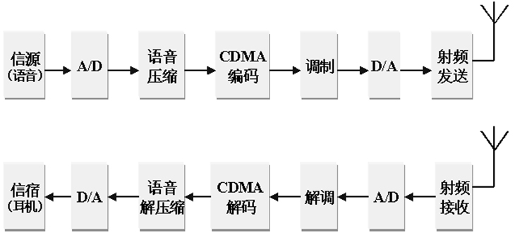 (2)收端:接收、下變頻、解調、CDMA譯碼、擴張、還原語(yǔ)音。