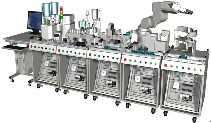 機電一體化綜合實(shí)訓考核系統是基于國家中長(cháng)期人才發(fā)展規劃綱要,對經(jīng)濟社會(huì )發(fā)展重點(diǎn)領(lǐng)域急需緊缺專(zhuān)門(mén)人才培養的需要,依據國家相關(guān)職業(yè)工種培養及鑒定標準,結合中國當前制造業(yè)的崗位需求設計研發(fā)。機電一體化綜合實(shí)訓考核系統由“工作站”形式綜合體現,“工作站”包含機電一體化“工作島”,電氣裝配臺,機械裝配臺,工具、資料柜及其他附屬工作設施,不但讓操作者在工作中實(shí)習訓練了機電專(zhuān)業(yè)技能,同時(shí)也體驗到職業(yè)素養中的社會(huì )能力與方法能力!肮ぷ髡尽钡暮诵氖恰肮ぷ鲘u”,由MPS模塊化生產(chǎn)線(xiàn)設備組成,共分為液體混合灌裝、組裝加工、檢測判別、機器人和智能倉儲五個(gè)工作島設備組成,工作島由PLC、變頻器、伺服驅動(dòng)、步進(jìn)驅動(dòng)、氣動(dòng)元件、觸摸屏等工業(yè)控制器件構成,操作者需要具備機械裝調、電氣管路連接、程序設計、機器人操作、傳感器裝調、檢修排故、觸摸屏組態(tài)等現代制造業(yè)崗位必要的技能,設備技術(shù)涵蓋面廣,定位具有前瞻性,是機電一體化專(zhuān)業(yè)教學(xué)實(shí)習、技能鑒定和技能競賽的絕佳載體。