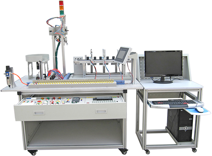 光機電一體化實(shí)訓實(shí)訓臺架為鋁合金導軌式,實(shí)訓考核裝置PLC模塊的I/O 端子、變頻器的接線(xiàn)端子、各常用模塊與PLC的連接端子,均與安全插座連接,使用帶安全插頭的導線(xiàn)進(jìn)行電路連接;各指令開(kāi)關(guān)、光電開(kāi)關(guān)、傳感器和指示元件的電路,則通過(guò)端子排進(jìn)行連接。插拔線(xiàn)連接電路與端子牌連接電路相結合,既保證學(xué)生基本技能的訓練、形成和鞏固,又保證電路連接的快速、安全和可靠。
