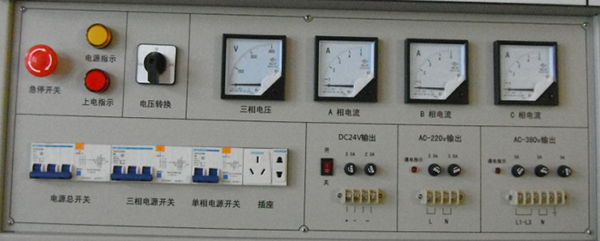采用三相五線(xiàn)交流電源供電,帶有漏電保護、急停按鈕等保護措施;具有電源指示燈和供電指示燈;帶有電壓表、電流表,可以實(shí)時(shí)檢測裝置的電壓、電流;帶有三相電源輸出、單相電源輸出、DC24V電源輸出。