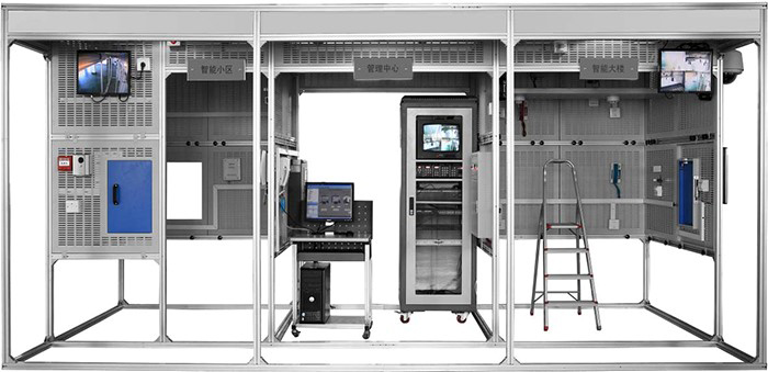 由鋁合金型材框架和安裝布線(xiàn)網(wǎng)孔板組成,4660mm×2220mm×2330mm(長(cháng)×寬×高),分為智能大樓、智能小區、管理中心和樓道等區域,智能大樓設計為兩層結構,器件采用自攻螺絲和工程塑料卡件配合安裝。 |