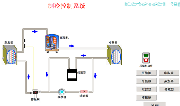 5、工作流程圖板3套:工作流程圖板詳細說(shuō)明制冷系統流程、監測點(diǎn)溫度、系統壓力、工作狀態(tài)指示、系統部件說(shuō)明。