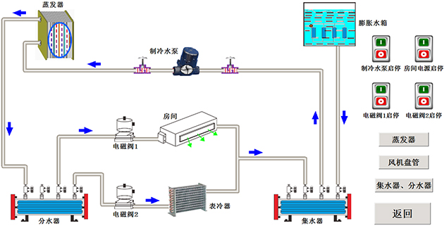 (1)、系統主要部件說(shuō)明組成:如壓縮機、卻水泵、冷卻風(fēng)機、風(fēng)機盤(pán)管、分水器、集水器、表冷器等。
