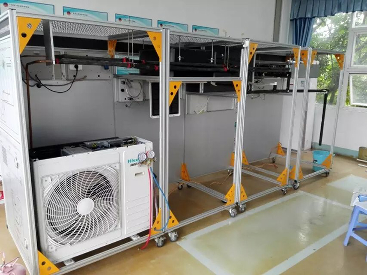 (6)產(chǎn)品配置:采用模塊設計,以多聯(lián)機(水冷)為母機,分別設置三個(gè)不同類(lèi)型的室內機(掛壁式、嵌入式、風(fēng)機盤(pán)管式),每臺室內機制冷量≥2.8kW、制熱量≥3.2kW、循環(huán)風(fēng)量≥500m3/h。在臺架的立面,設置液晶顯示屏、工作流程圖、線(xiàn)路原理圖等,在原理圖面板上安裝安全插,能測量關(guān)鍵點(diǎn)參數。同時(shí)配備工具臺、真空泵、脹口擴口裝置各一套,壓力表、管材及配件、分歧管、各種安全連接線(xiàn)、測量?jì)x表、配套工具、氮氣等若干。