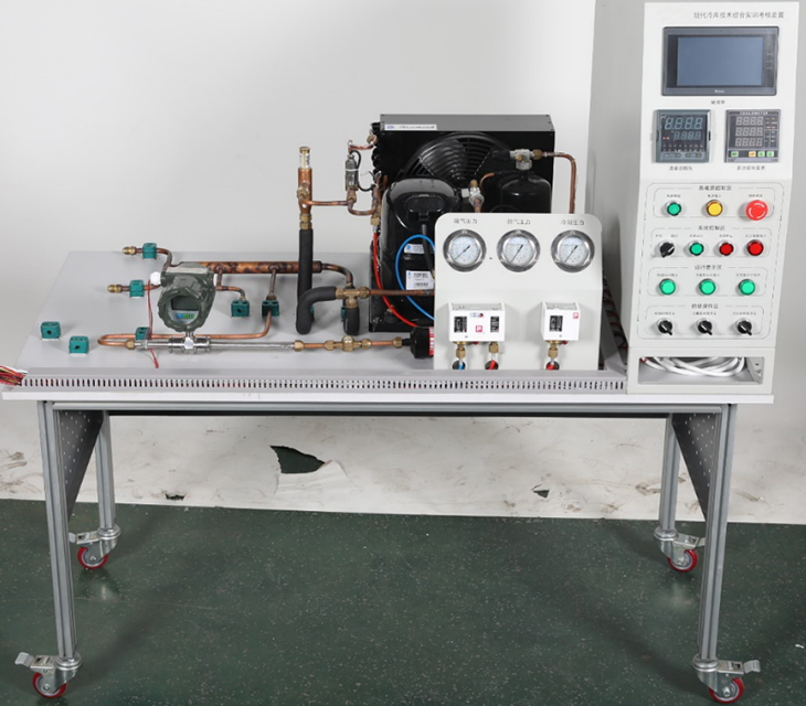 主要由冷凝機組、光管式蒸發(fā)器、冷風(fēng)機、高低壓開(kāi)關(guān)、電子膨脹閥(或電磁閥與熱力膨脹閥組合)及能量調節閥等通過(guò)管路連接,組成一個(gè)完整的制冷系統。為滿(mǎn)足競賽(實(shí)訓)要求,工作臺安裝板和側板采用中纖高密度纖維板,學(xué)員可在上面自由安裝制冷元器件、手閥、電磁閥、接線(xiàn)盒、表組等配件(大件已提前固定好,如冷凝機組、電氣控制箱等),系統管路由學(xué)員自己發(fā)揮搭建,也可參照說(shuō)明書(shū)上的效果圖進(jìn)行組建。機組架由美觀(guān)結實(shí)的型材組裝而成,并配有帶剎車(chē)萬(wàn)向輪,方便調整設備的擺放位置。