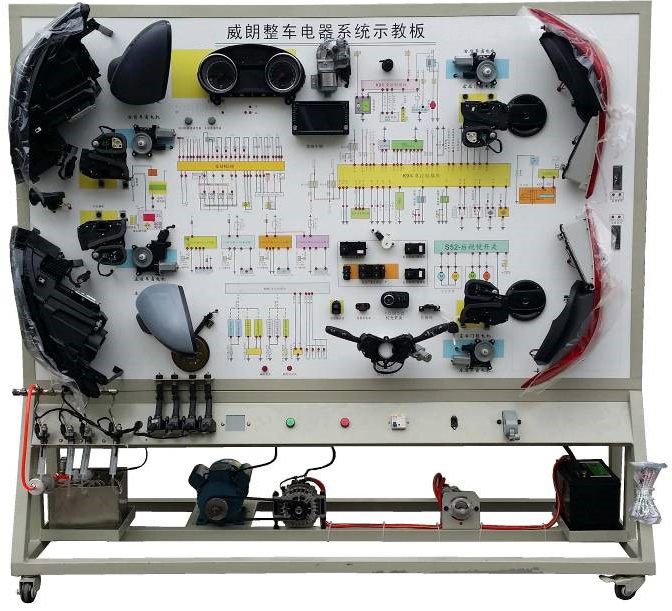 2.設備面板采用耐創(chuàng )擊、耐污染、防火、防潮的高級鋁塑板,表面經(jīng)特殊工藝噴涂底漆處理;面板打印有永不褪色的彩色電路圖;學(xué)員可直觀(guān)對照電路圖和實(shí)物,認識和分析汽車(chē)整車(chē)電器各系統的工作原理。