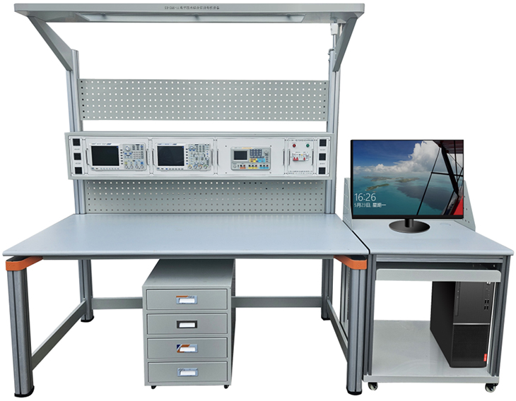 電子技術(shù)綜合實(shí)訓考核設備主要由工作臺、實(shí)訓屏、實(shí)訓屏模塊、工具柜、電路實(shí)訓模塊、儀器工具耗材包組成。桌身采用鋁型材,桌面采用25mm厚高密度纖維板,外貼防火板,PVC截面封邊。工作臺設有防靜電配套裝置,桌面上方有實(shí)訓屏、模塊盒安放橫梁、工具網(wǎng)孔板、高檔條形LED照明。