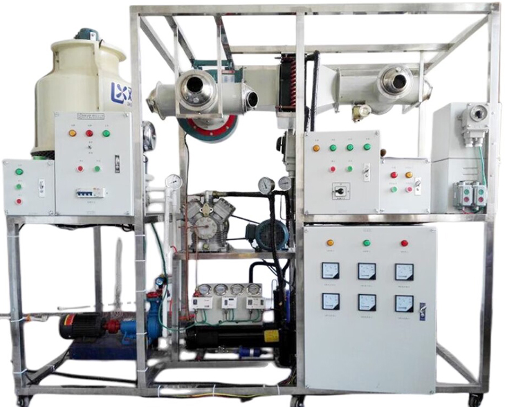 實(shí)訓裝置主要由控制臺、水冷制冷機組、高溫風(fēng)機,風(fēng)機管道,管道調節閥門(mén)、主機實(shí)訓模塊、連軸式冷卻水泵,冷卻塔,溫度和壓力傳感器等組成溫度和壓力表等組成