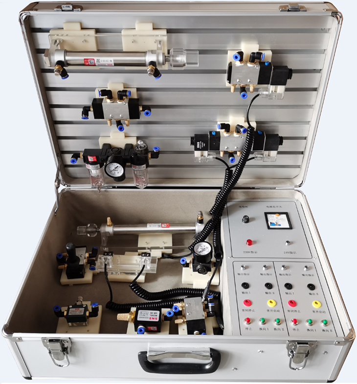 1、實(shí)訓箱主要由鋁合金機箱、各種標準氣動(dòng)工業(yè)元件、和電氣控制器件等組成。