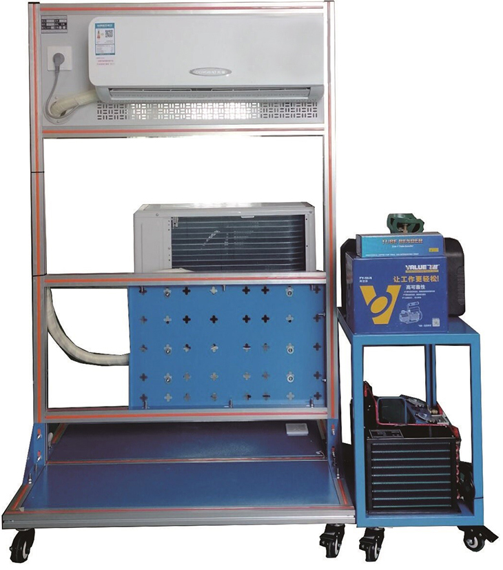 采用有40*40鋁材為框架,內嵌入鋼板的結構方式,底部安裝4個(gè)平移輪子,直觀(guān)展示了現代空調調試、安裝過(guò)程中所需常見(jiàn)工具,操作方法,便于教學(xué)演示講解及學(xué)生對空調組成、制冷循環(huán)等、知識的理解掌握。
