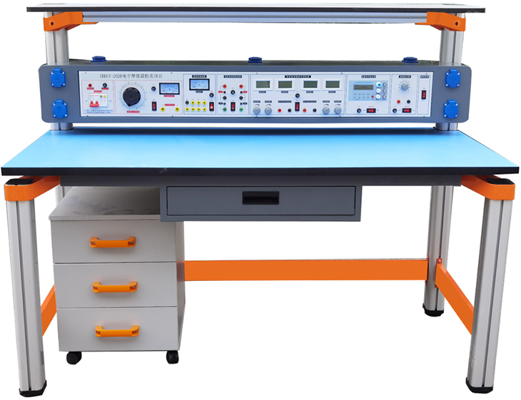 電子焊接裝配實(shí)訓裝置由儀器架、主機箱、實(shí)驗桌、移動(dòng)矮柜、學(xué)生凳等組成。實(shí)驗裝置支架與實(shí)驗桌可組合、可拆裝。支架與桌腳一體,鋁合金結構。
