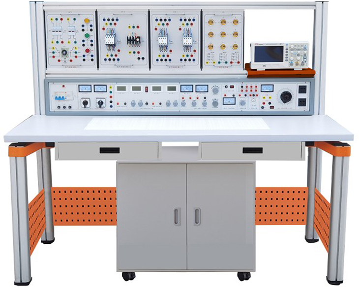 裝置由主機箱、實(shí)驗桌(裝有九孔萬(wàn)能插件板)、電氣控制實(shí)驗掛箱,實(shí)驗掛箱支架、移動(dòng)矮柜、示波器架、透明創(chuàng )新實(shí)驗模塊、學(xué)生凳等組成。實(shí)驗裝置支架與實(shí)驗桌可組合、可拆裝。支架與桌腳一體,鋁合金結構;電氣控制實(shí)驗掛箱及各實(shí)驗模塊可根據實(shí)驗需求自由組合實(shí)驗。
