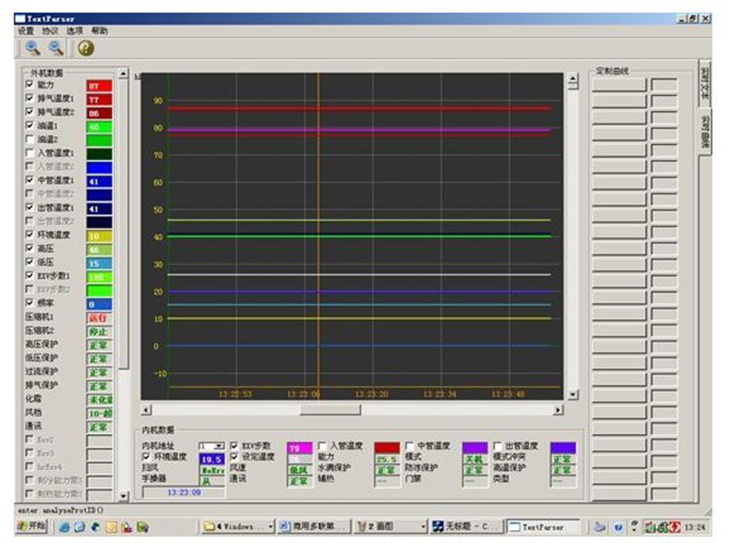 2)、軟件控制,能在線(xiàn)控制系統的溫度,讀取機組在最佳溫度系統制冷冷媒的流量開(kāi)度數,調整制冷機組的過(guò)熱度,過(guò)冷度。該文本顯示界面的左側,以文本的形式實(shí)時(shí)顯示當前機組的運行數據。在界面右側的上半部分,是對通訊信息的顯示,包括通訊角色及通訊端口的設定值以及對當前通訊狀態(tài)的顯示。在界面右側的下半部分"數據信息"中,顯示當前接收到哪種數據幀、接收到的數據幀的地址、等信息。具有上位機調節的線(xiàn)上和手動(dòng)調節功能: